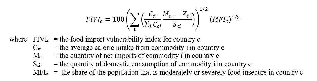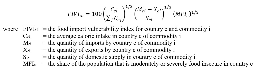 The first term in parentheses is the weighted average of the import dependence ratio ((Mci-Xci)/Sci) across the 15 staple commodities, where the weights are the caloric contribution of each commodity to total staple calories in that country (Cic/ΣCic). Note that, unlike the calculation for the commodity-level FIVI, the summation in the denominator is limited to the 15 staple foods. As above, if the country exports a commodity, the import dependency ratio is set to zero for that commodity, reflecting the fact that it is not vulnerable to higher world prices of that commodity. The weighted average of the import shares for each commodity is equal to the share of the calories from the 15 staple foods that is imported. The second term is the share of the population that is moderately or severely food insecure (MFIc)