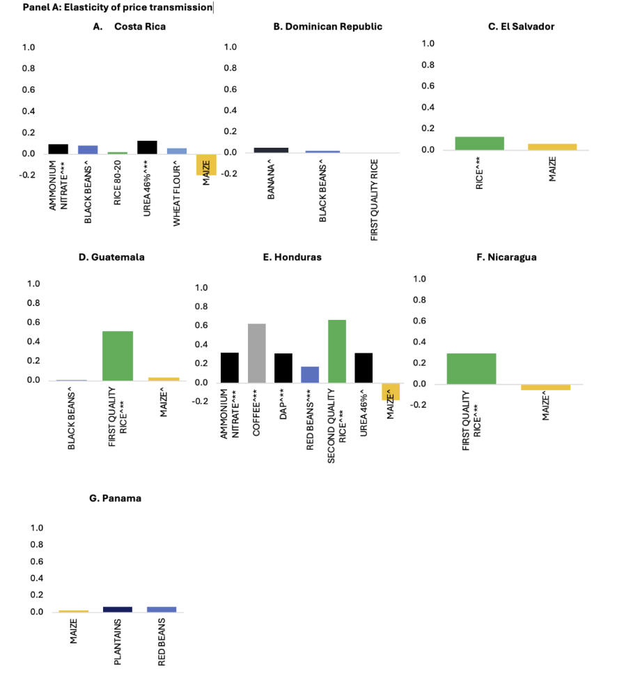 Prices: The analysis finds a low degree of international-to-domestic price transmission for maize, beans, wheat, and bananas, but a moderate degree in rice, coffee, and fertilizers. Honduras shows some of the highest levels of price transmission across several products, while Guatemala and Nicaragua exhibit moderate price transmission for rice, and Costa Rica, El Salvador, and Panama have little to no evidence of price transmission.
