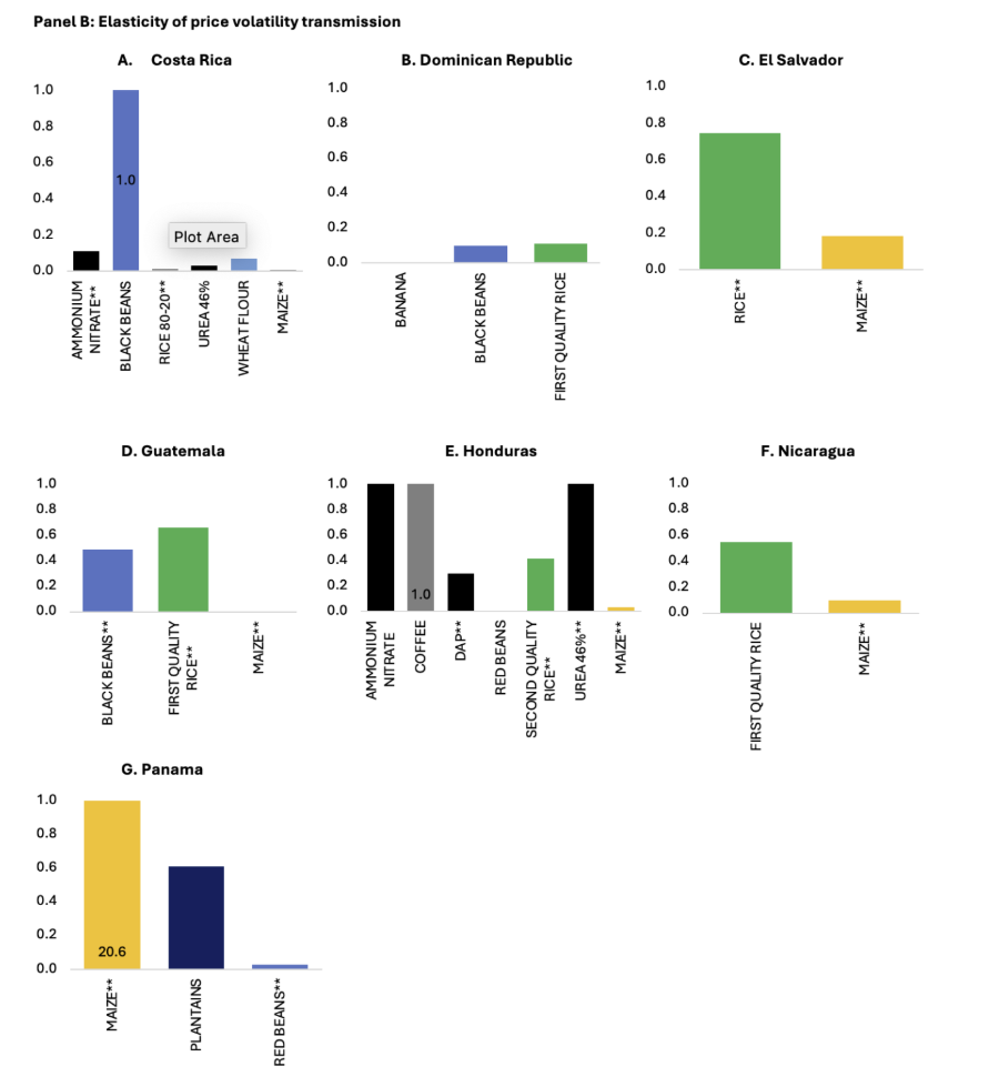 A recent study by IFPRI and the World Bank examines the degree of price and volatility transmission from international to domestic food and fertilizer markets in seven countries in Central America and the Caribbean (Costa Rica, El Salvador, Guatemala, Honduras, Nicaragua, Panama, and the Dominican Republic). The study uses monthly international and domestic price data for 26 key food staples, cash crops, and fertilizers across the countries and relies on a multivariate generalized autoregressive conditional heteroskedasticity (GARCH) approach—a robust statistical technique used to model volatility—to evaluate domestic responses to a shock in the international market. The analysis focuses on the level of transmission in the short run (one-month responses), permitting us to isolate the direct domestic response to an international shock. Focusing on the short-run level of transmission is warranted since vulnerable households, which typically face liquidity constraints, are thus less able to cope with short-term shocks.