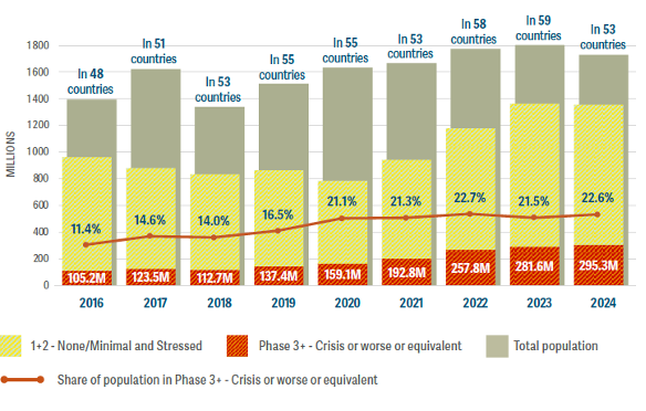 The world faced a stark inflection point in 2024, as the continued rise in the number of people facing crisis-to-catastrophic levels of acute food insecurity meets sharp reductions in funding for humanitarian assistance. The 2025 Global Report on Food Crises (GRFC), released today, reports that 295.3 million people across 53 countries/territories faced acute food insecurity in 2024. This represents a tripling of the number of people facing acute hunger since 2016 and a doubling since 2020 (Figure 1).