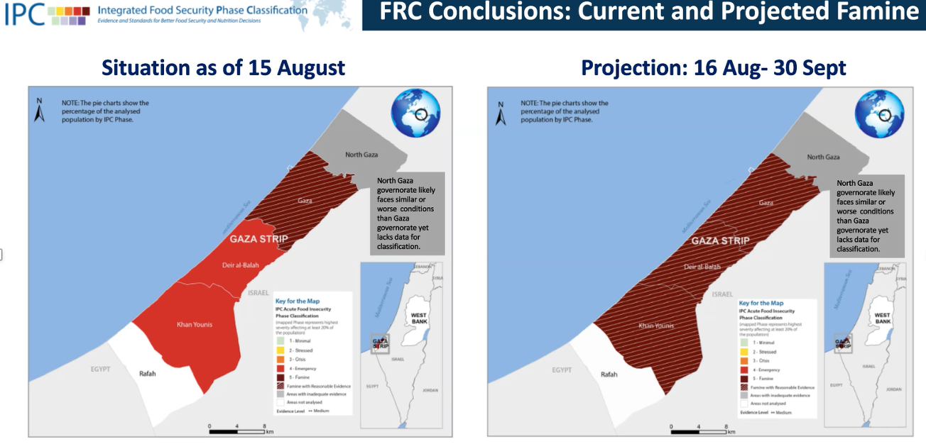 The chance to prevent widespread famine in the Gaza Strip has passed, according to the IPC Famine Review Committee (FRC). The prolonged food crisis in Gaza reached an unprecedented and devastating level in July and August, with the FRC confirming famine in Gaza Governate and projecting famine thresholds to be crossed in Deir al-Balah and Khan Younis Governates in the coming weeks. This latest update places more than half a million people at risk of starvation.